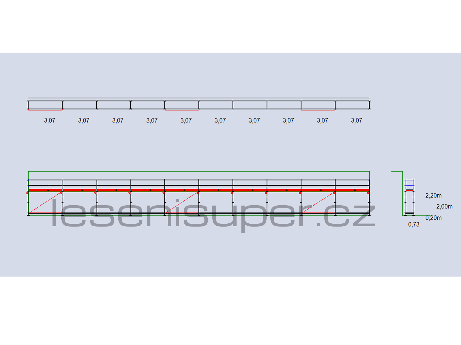 Rozměr pracovní plochy délka 30,7m x výška 4,4m. Celá sada váží 878 kg.