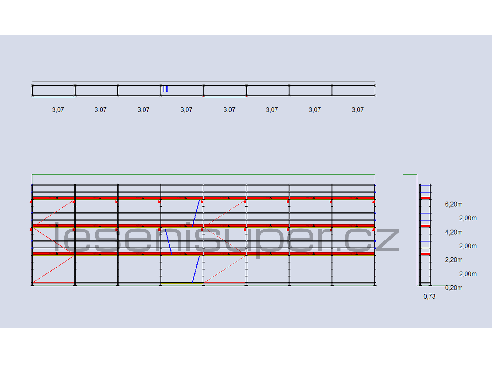 Rozměr pracovní plochy délka 24,56 m x výška 8,4m. Celá sada váží 2387 kg