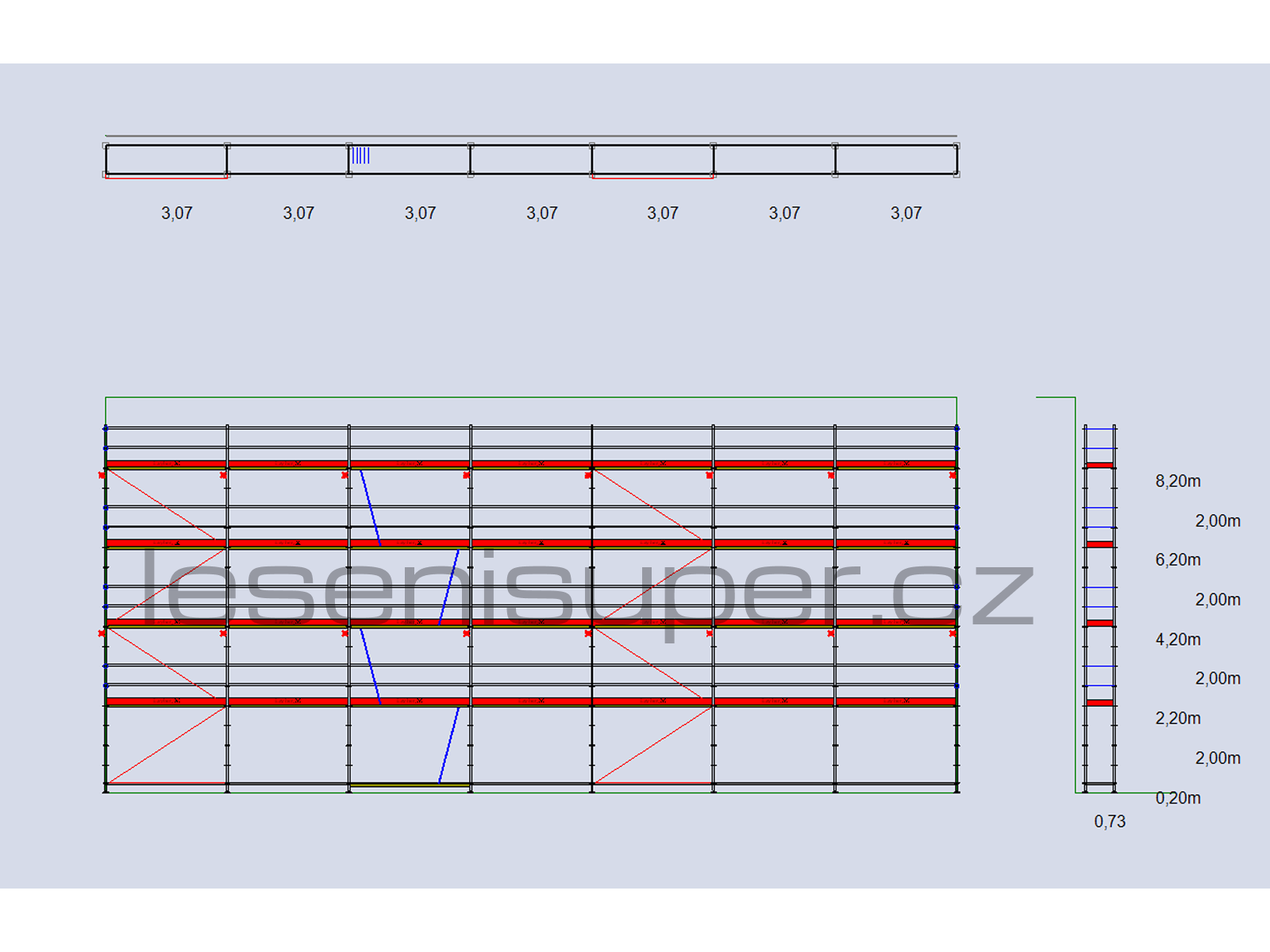 Rozměr pracovní plochy délka 21,49 m x výška 10,4 m. Celá sada váží 2156 kg