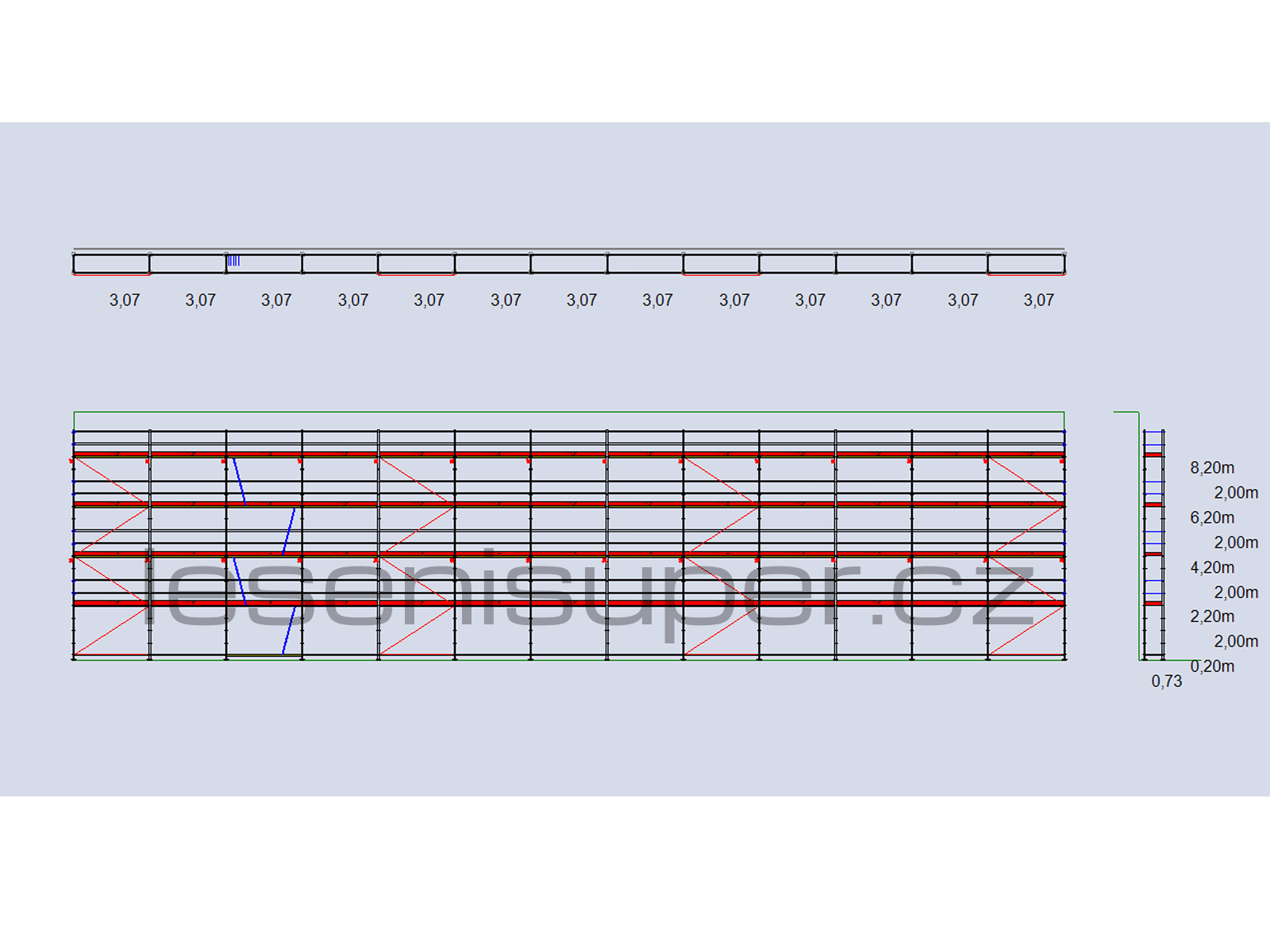 Rozměr pracovní plochy délka 39,91 m x výška 10,4 m. Celá sada váží 3917 kg